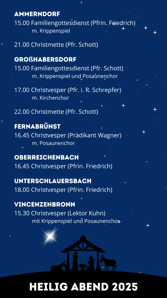 Weihnachten 2025 Beitrag veröffentlicht am 23. Dezember 2025 Für alle weiteren Gottesdienste an den Feiertagen dem Link folgen: Terminübersicht. Beitrags-Navigation Kirchenbote Dezember 2025 / Januar 2026