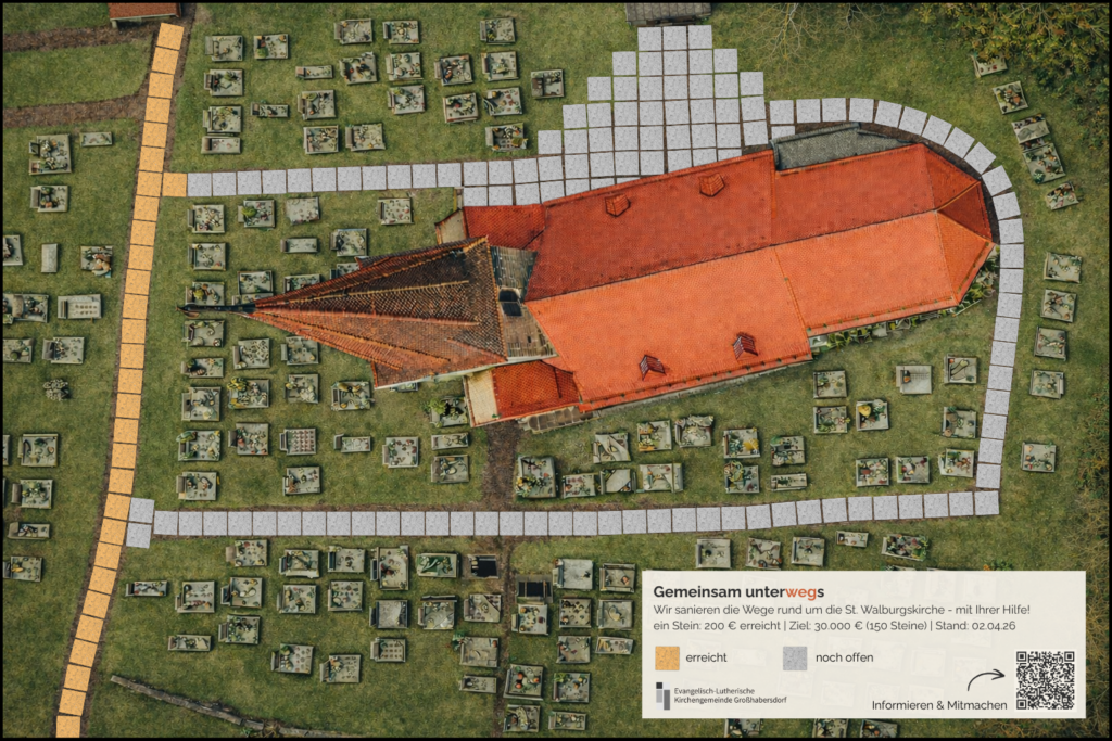 Im Sommer 2026 soll in Großhabersdorf ein großes Projekt umgesetzt werden: die Sanierung der Hauptwege rund um die St.-Walburgskirche. Viele Wegabschnitte sind stark beschädigt (siehe Foto). Stolperfallen erschweren den Zugang zur Kirche – erst recht mit Rollator, Kinderwagen oder bei Nässe und Glätte.